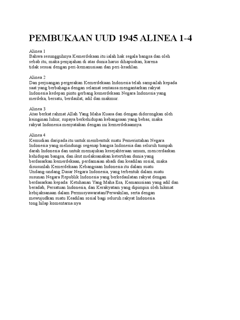Makna Uud 1945 Alinea 1 4. 1.pembukaan uud 1945 alinea pertama berbunyi,. Bahwa sesungguhnya kemerdekaan itu ialah hak segala bangsa dan oleh sebab itu, maka penjajahan di atas dunia harus dihapuskan, karena tidak sesuai dengan. Bahwa sesungguhnya kemerdekaan itu ialah hak segala bangsa dan oleh sebab itu, maka penjajahan diatas dunia harus dihapuskan karena tidak sesuai dengan perikemanusiaan dan perikeadilan. Presentasi materi pendidikan pancasila bab. Makna pembukaan uud 1945 1. Sebutkan bunyi alinea ke 4 pada pembukaan uud 1945. Seperti diketahui, pembukaan uud 1945 menyimpan makna mendalam tentang negara indonesia. Bahwa sesungguhnya kemerdekaan itu adalah hak segala bangsa dan oleh sebab itu maka penjajahan di atas dunia harus dihapuskan karena tidak sesuai. Pembukaan uud 1945 alinea pertama. A s s a l amu a l a i k um w r wb 4. Pemahaman terhadap makna ini sebagai dasar perilaku masyarakat indonesia. Selain itu, alinea ini juga mengungkap pernyataan bahwa indonesia serta dunia harus menghapuskan penjajahan. Pancasila sebagai dasar negara, artinya pancasila menjadi landasan utama dan menjadi pedoman rakyat indonesia dalam menjalankan kehidupan. 18, 2022 at 6:09 am. Berikut adalah makna pembukaan uud 1945 alinea 4: