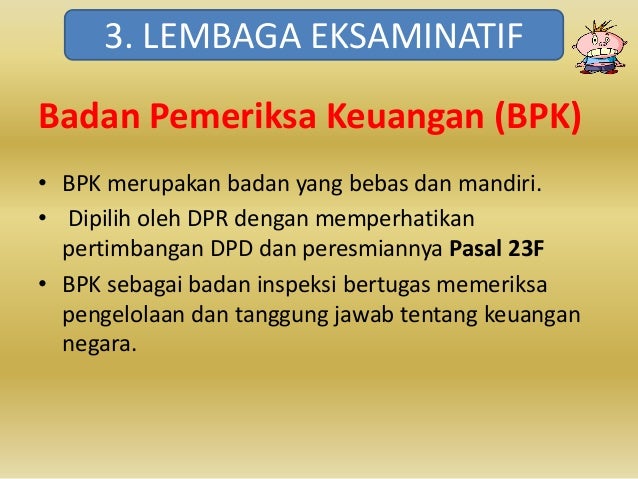 Tugas Lembaga Eksaminatif. Di indonesia lembaga eksaminatif adalah badan pemeriksa keuangan (bpk). Sesuai dengan pasal 3 ayat 1 uud 1945 mpr amandemen mempunyai tugas dan wewenang sebagai berikut : Bpk merupakan lembaga negara yang bebas dan mandiri dalam memeriksa pengelolaan dan tanggung jawab. Lembaga ini terdiri dari beberapa badan. Badan pemeriksa keuangan (bpk) adalah salah satu lembaga tinggi negara yang ada di luar lembaga legislatif, eksekutif, dan yudikatif. Lembaga eksaminatif dalam susunan ketatanegaraan indonesia merupakan lembaga negara indonesia yang independen. Ma merupakan lembaga tinggi negara yang memegang kekuasaan kehakiman. Lembaga ini adalah lembaga pemerintah pusat yang dibentuk untuk melaksanakan tugas pemerintahan tertentu dari presiden. Badan pemeriksa keuangan berada dibawah presiden. Apa tugas /wewenang lembaga tersebut? Bersangkutan dengan badan yang mengadili. Apa saja dasar hukum yang terkait dengan lembaga tersebut? Memberi pertimbangan kepada kepala negara yaitu presiden terkait ruu apbn. Mengajukan rancangan uud yang memiliki kaitan dengan otonomi daerah serta bertugas dalam mengawasi pelaksanaannya. Ada tiga jenis lemabaga negara di indonesia:
