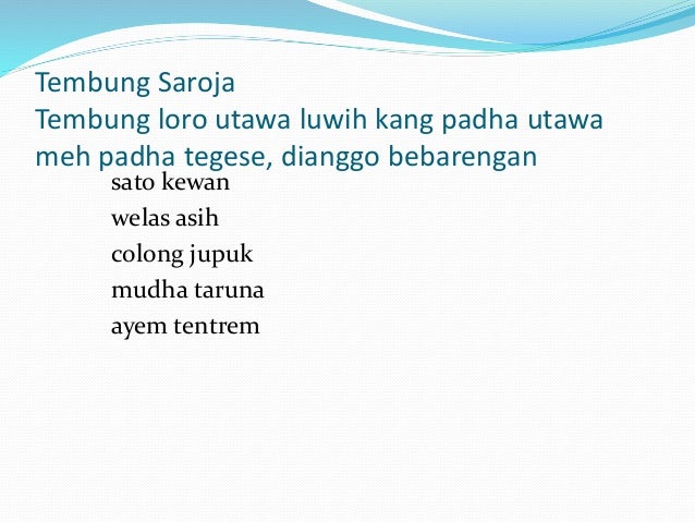 Alif nek karo kancane, jembar segarane. Budi saben dina adus kringet kanggo nyukupi kebutuhan kaluwargane. Seneng nyatur wong, seneng memisuh. Kasar tembunge tegese tembung saru; Jembar segarane (sugih pangapura) 4. Terkadang kita hanya perlu meluaskan hati seperti luasnya samudra, untuk membuat segala kepahitan hidup menjadi tak terasa pahit sedikitpun, dan untuk membuat segala keruh yang mewarnai hati menjadi jernih kembali. Budi saben dina adus kringet kanggo nyukupi kebutuhan kaluwargane. Tembung rerangken, tembung sesambungan, tembung kang kedadean saka tembung loro utawa luwih. Cengkiling, dhemen milara, sok nangani. Faiz kuwi wonge rai gedheg.