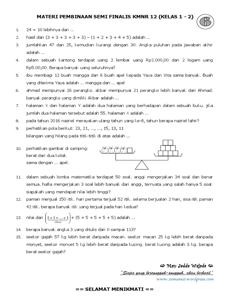 3 8 5 4 40 44 a 2. Kmnr adalah salah satu ajang lomba matematika yang bergengsi di indonesia. Soal disusun berdasarkan silabus tema 2 kelas 6 kurikulum 2013. Berikut ini adalah kumpulan soal ukk uas kelas 2 semester 2 tahun ajaran 2017 2018 dan file download soal ukk pkn bahasa indonesia ips ipa matematika dan bahasa inggris. Latihan online penyisihan kmnr kelas 1 dan 2. Berikut kumpulan soal babak penyisihan kmnr 10 (kompetisi matematika nalaria realistik) yang berlangsung pada 25 januari 2015. Download soal soal kmnr (kompetisi matematika nalaria & realistik) sekolah dasar (sd) 28 desember 2017 28 desember 2017 rohmadariwibowo, s.pd. Sebelumnya, uji soal mnr periode 2016/2017 diikuti 250.718 peserta, periode 2017/2018 diikuti 323.997 peserta, dan periode 2018/2019 diikuti 352.088 peserta. Soal pecahan kelas 3 : Contoh soal matematika kelas 3 sd bangsoal search bukusoalpapikostick gramediacom demikianlah pembahasan yang dapat kami sampaikan mengenai contoh soal kmnr kelas 3 sd.